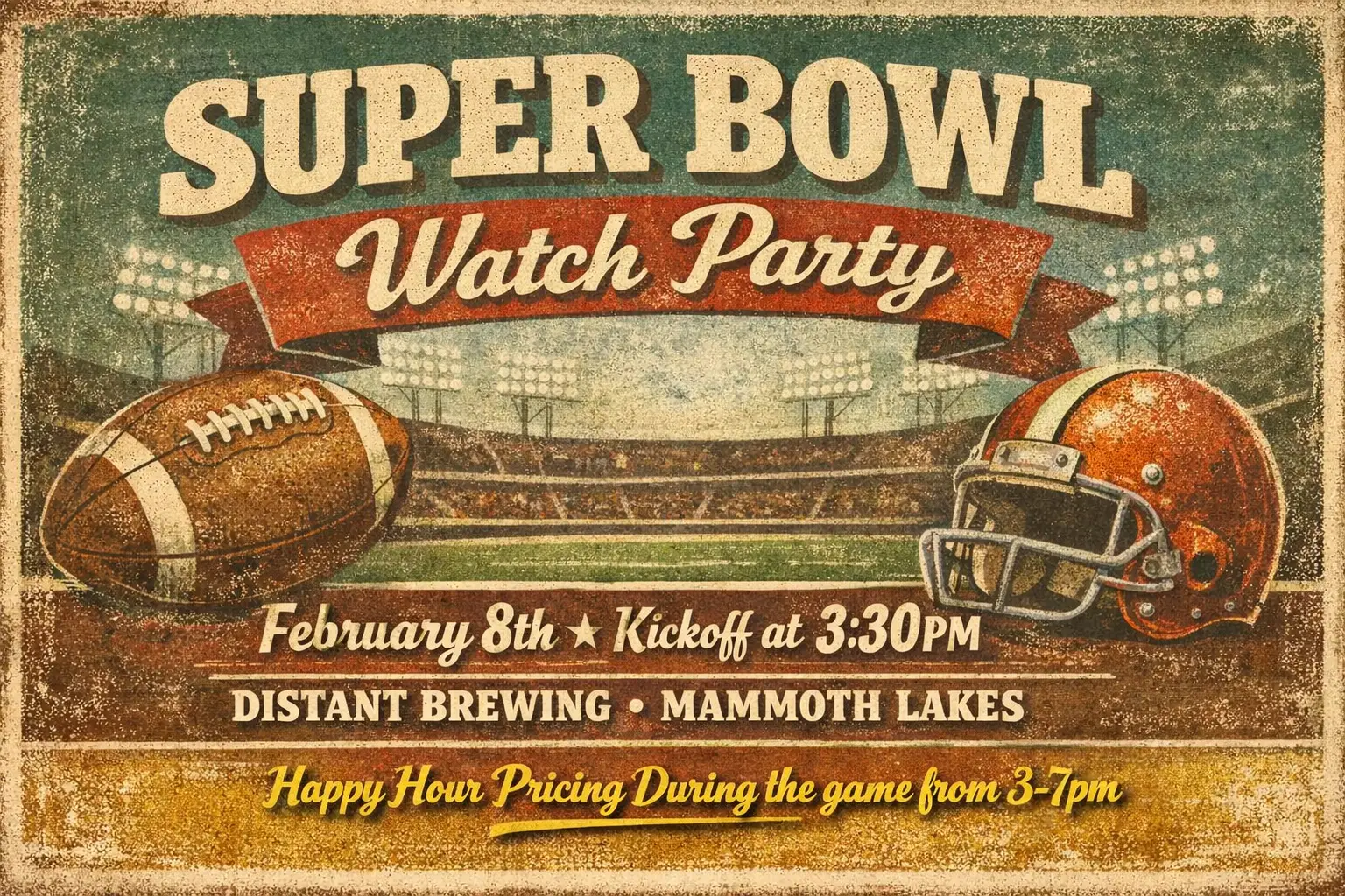 Distant Brewing 568 Old Mammoth Road, Mammoth Lakes, CA, United StatesJoin us at Distant Brewing for a Super Bowl Watch Party on February 8th, with kickoff at 3:30 PM. We’ll have the game on the big screens, the sound on, …