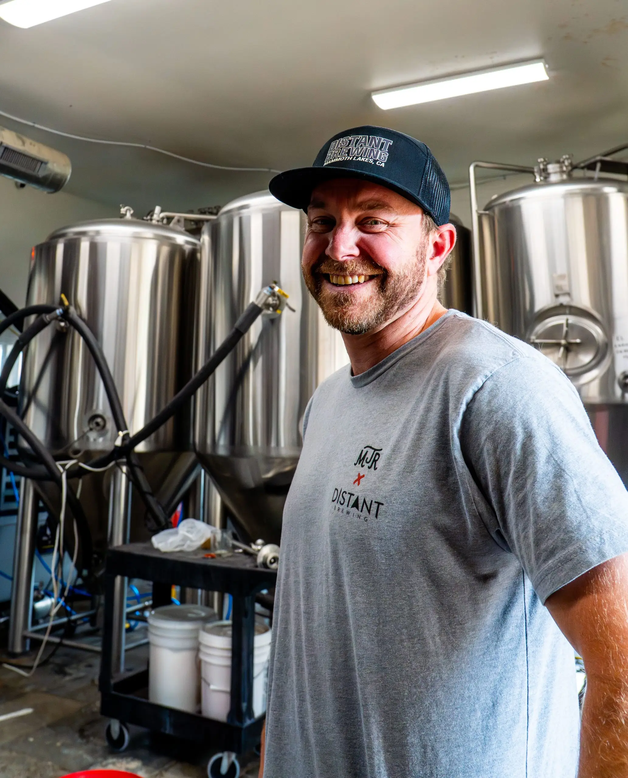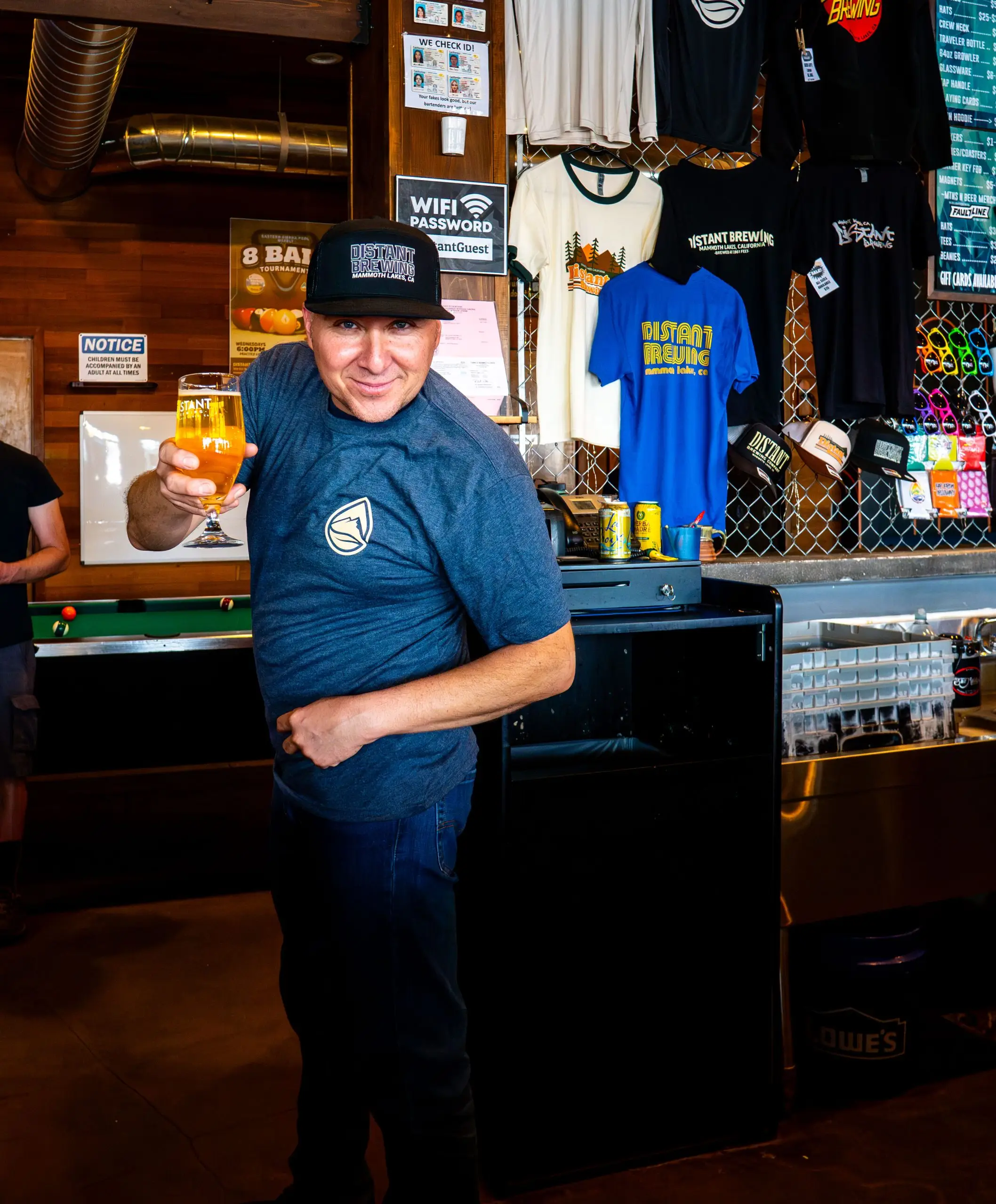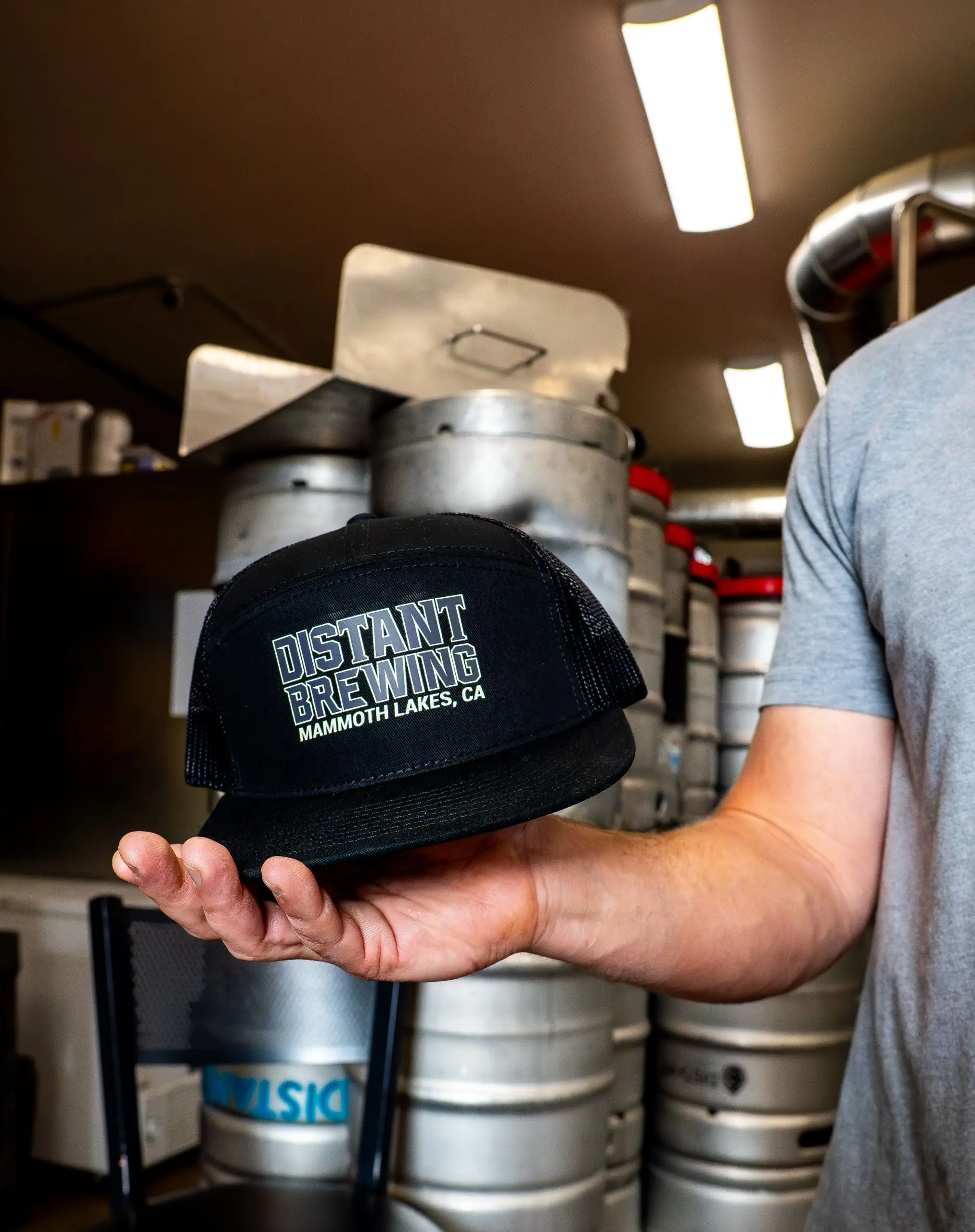 This is our first 7 panel hat we’ve ever created! The design is reminiscent of a college style font with DISTANT BREWING featured prominently on the front as well as a callout to our home, MAMMOTH LAKES, CA. The hat color is black.